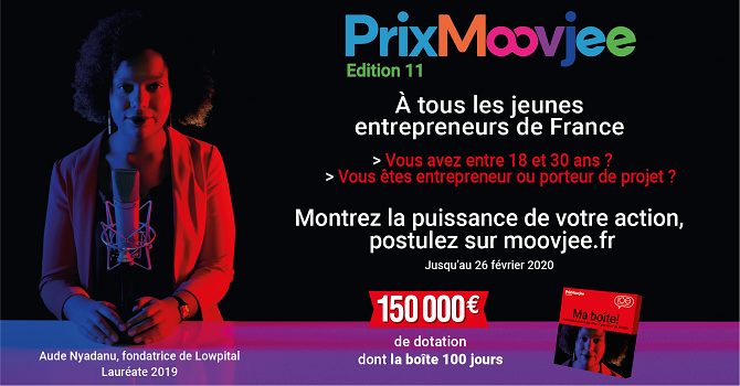 Le Prix Moovjee est le premier prix national ouvert aux jeunes entrepreneurs âgés de 18 à 30 ans inclus ! Participer au Prix Moovjee, c’est faire ses premiers pas dans la grande communauté des entrepreneurs, c’est découvrir, partager, s’entourer et se nourrir du dynamisme de chacun pour se lancer dans l’aventure entrepreneuriale.